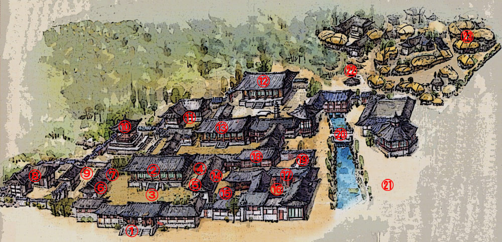 大長今テーマパークの全体の地図です。1番〜23番まであり、順番通りに回ると効率よく見学できます。